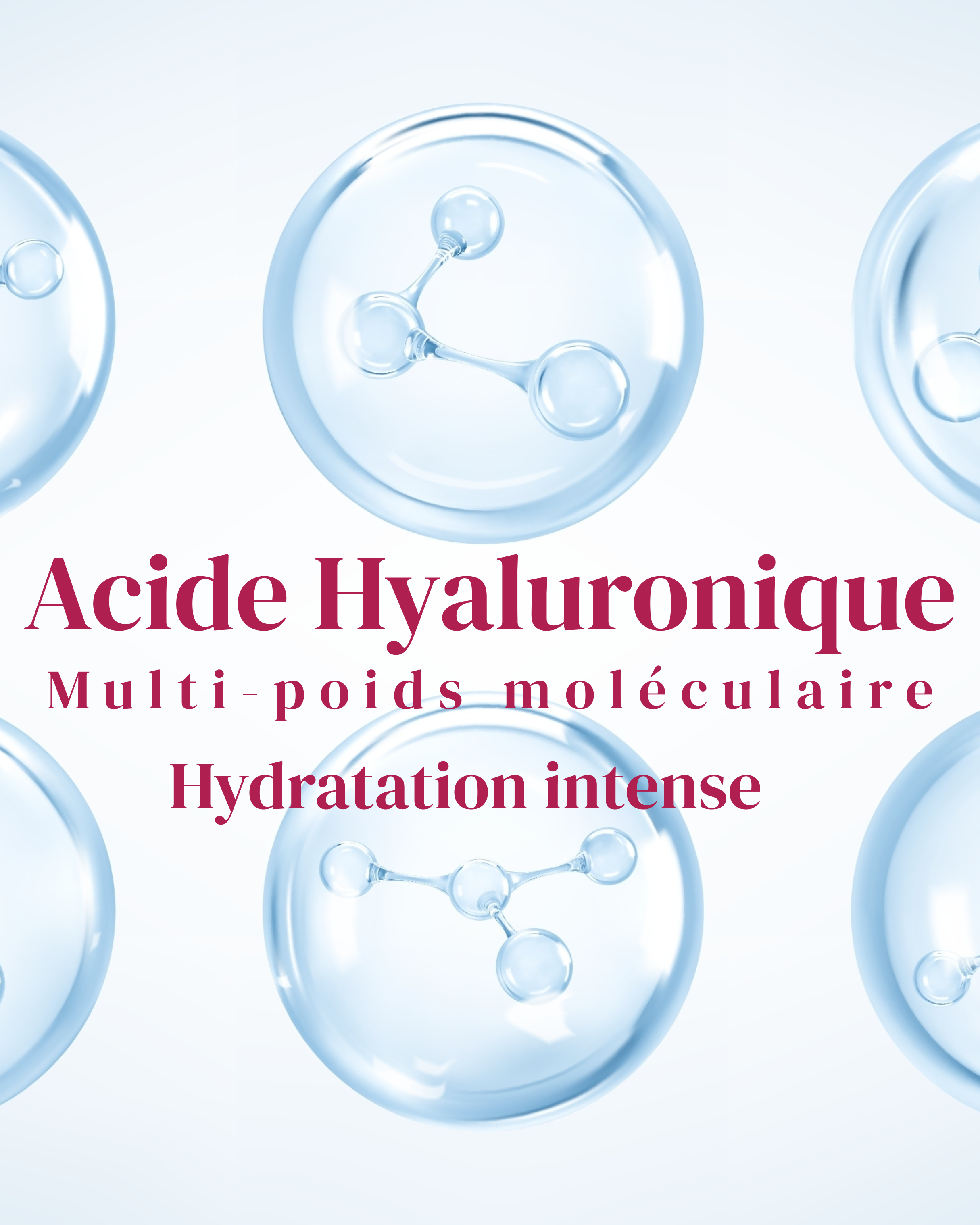 L’acide hyaluronique multi-poids moléculaire hydrate à tous les niveaux de la peau pour un effet repulpant, tandis que les AHA et la niacinamide exfolient en douceur, affinent le grain de peau et unifient le teint.
