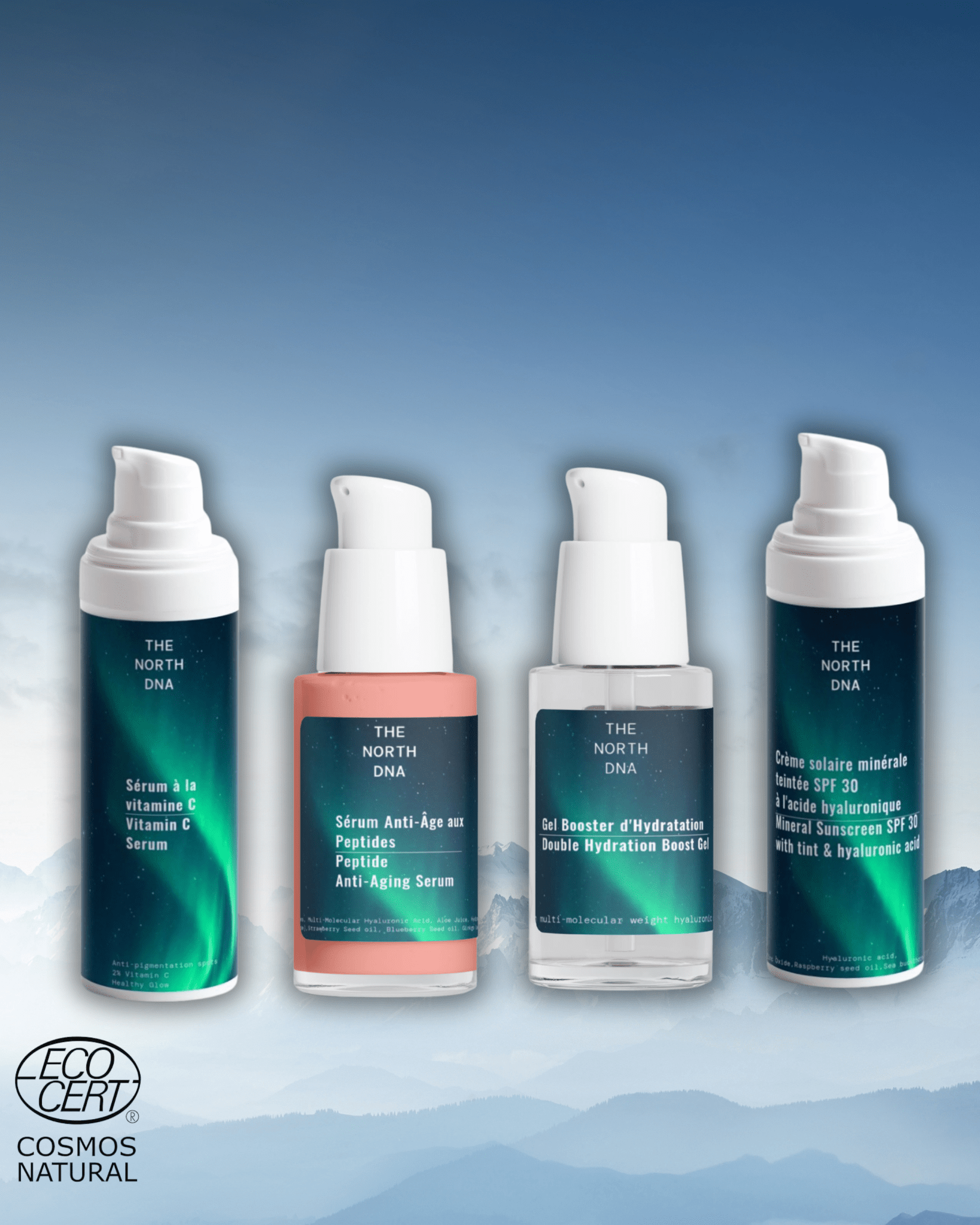 Voir fiches produits: du sérum antioxydant à la vitamine C; du sérum anti-âge aux peptides; du gel booster d'hydratation; de la crème solaire minérale teintée